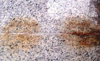 1、石材原材含鐵量較高(如美國白麻,黃砂巖等),空氣中二氧化碳和水侵入石材表面,與石材內部的鐵質反應生成二氧化鐵,并透過石材毛細孔排出,形成銹斑;