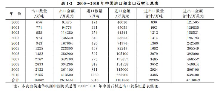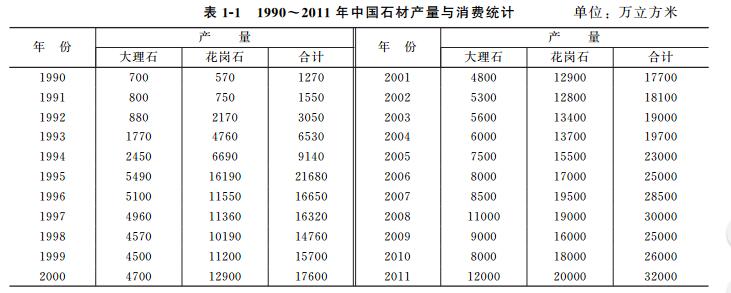 表1-1是1990~2011年22年來中國天然石材生產與消費的數量。從表1-1中可以看出石材正以前所未有的速度增長20多年間僅天然大理石、花崗石兩種就分別增長了17倍和35倍,并迅速進入普通家庭,而砂巖、板巖、洞石、水磨石、人造合成石還不在其中。表1-2為2000~2010年中國天然石材進出口貿易統計,不難看出,我國不但大量出口國產石材,還大量進口石材,以滿足人民日益豐富多彩生活的需求。